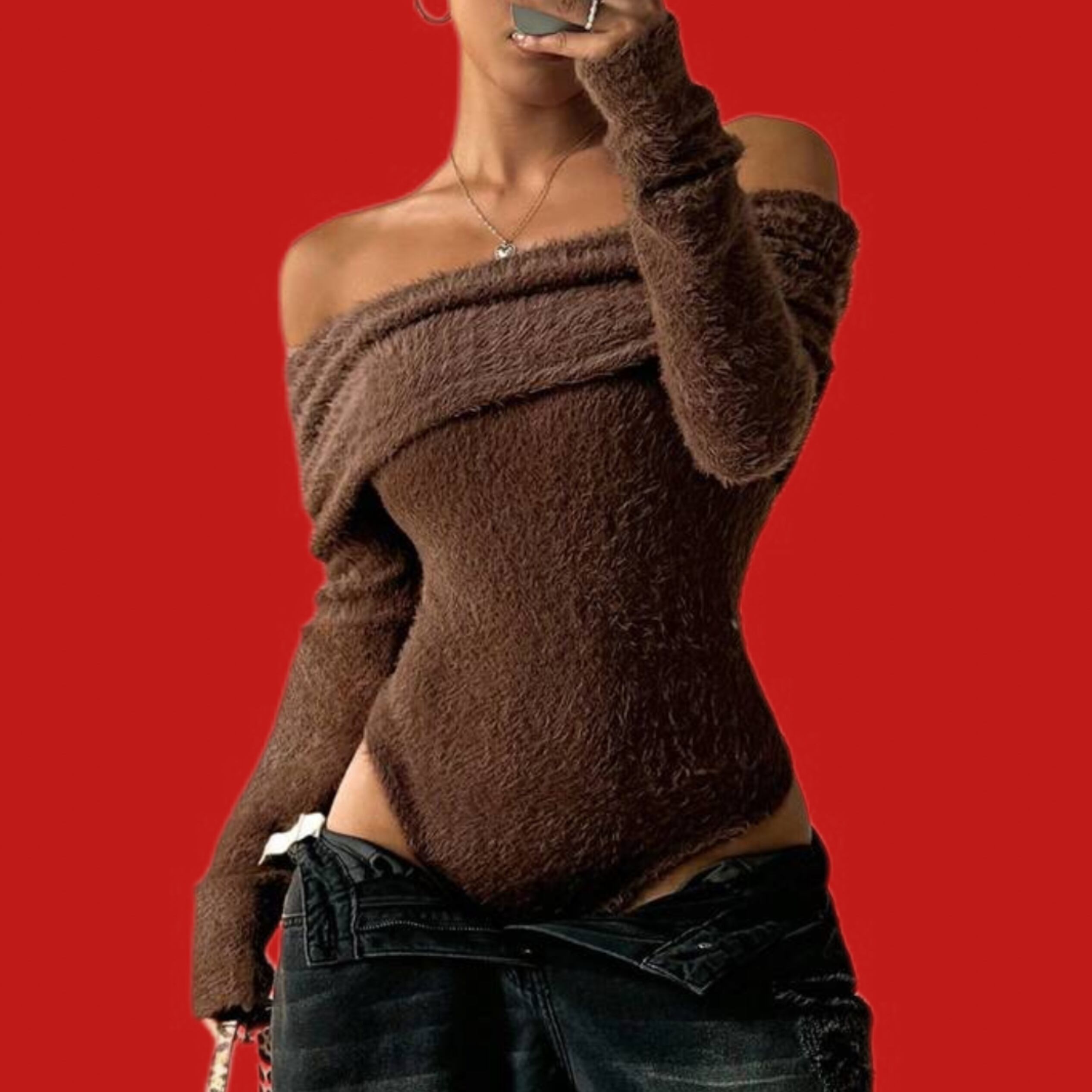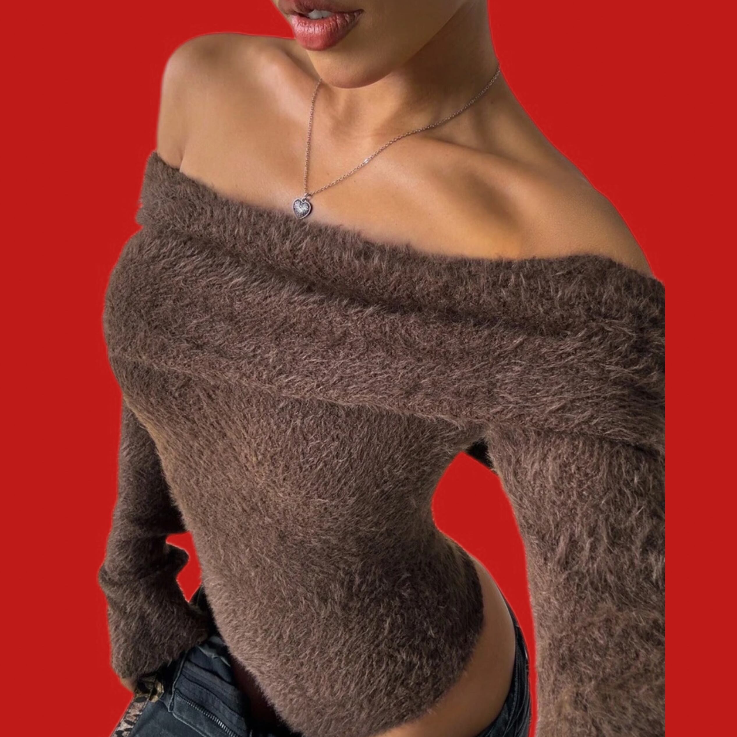 ふわふわのニットとオフショルダーで女性らしい色気のあるスタイルに。