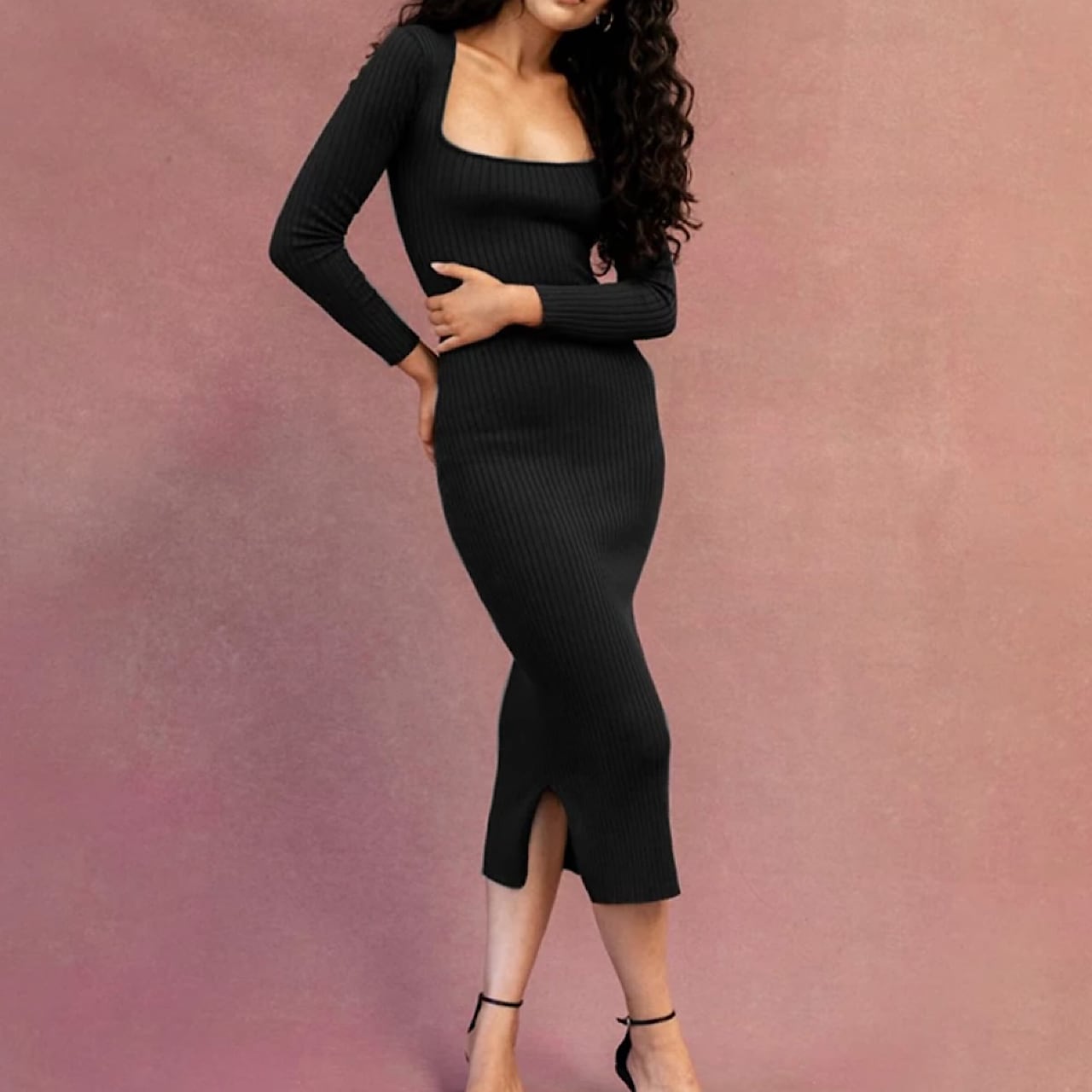 スクープネック☆ひざ下タイトワンピース 【BLACK】(海外インポート ストレッチ 無地)