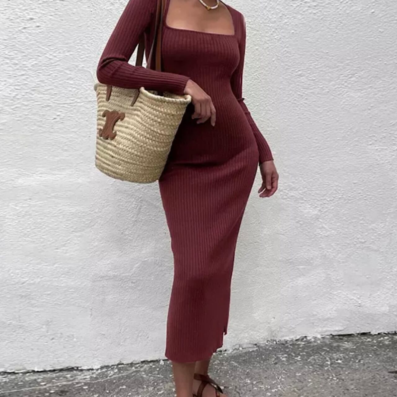 スクープネック☆ひざ下タイトワンピース Wine