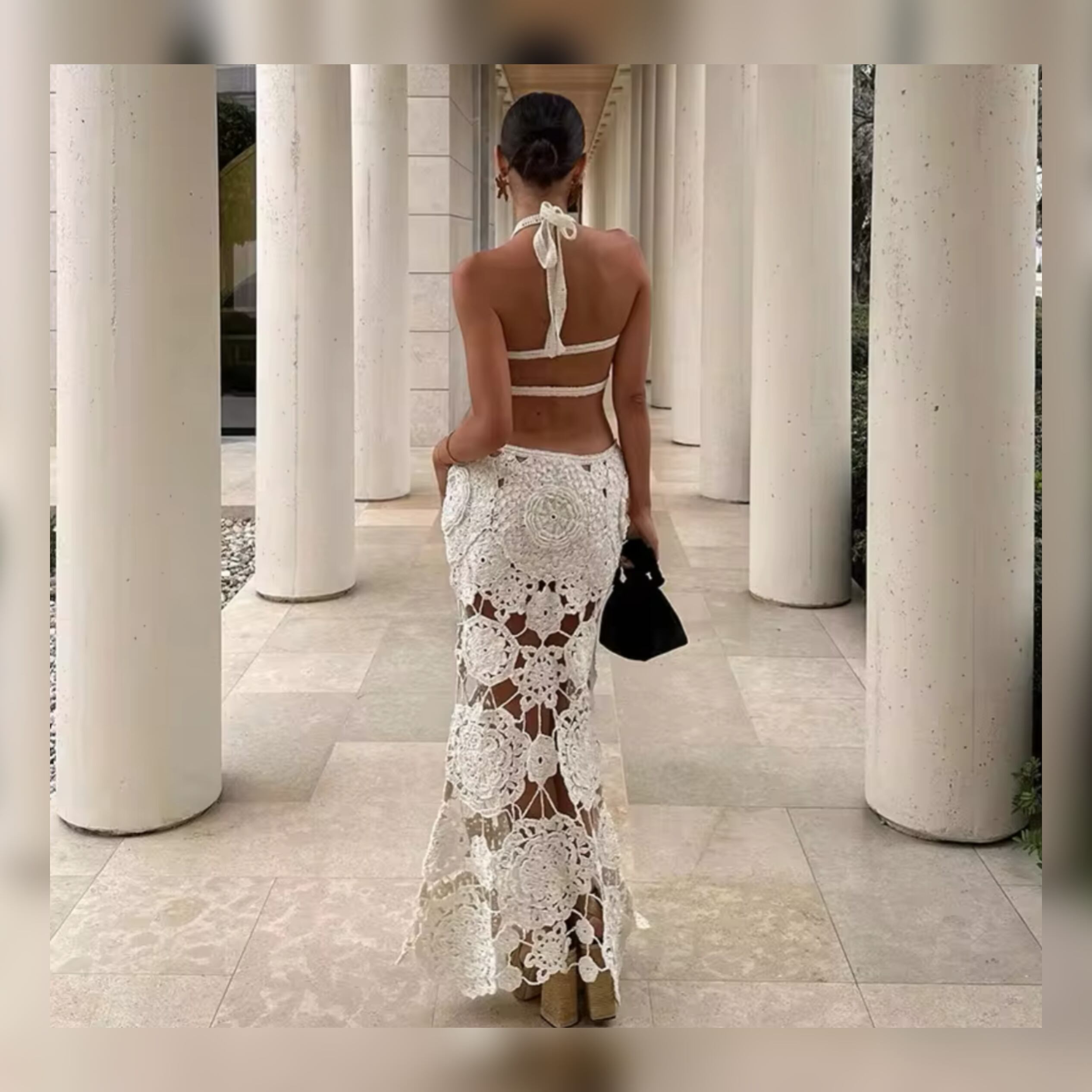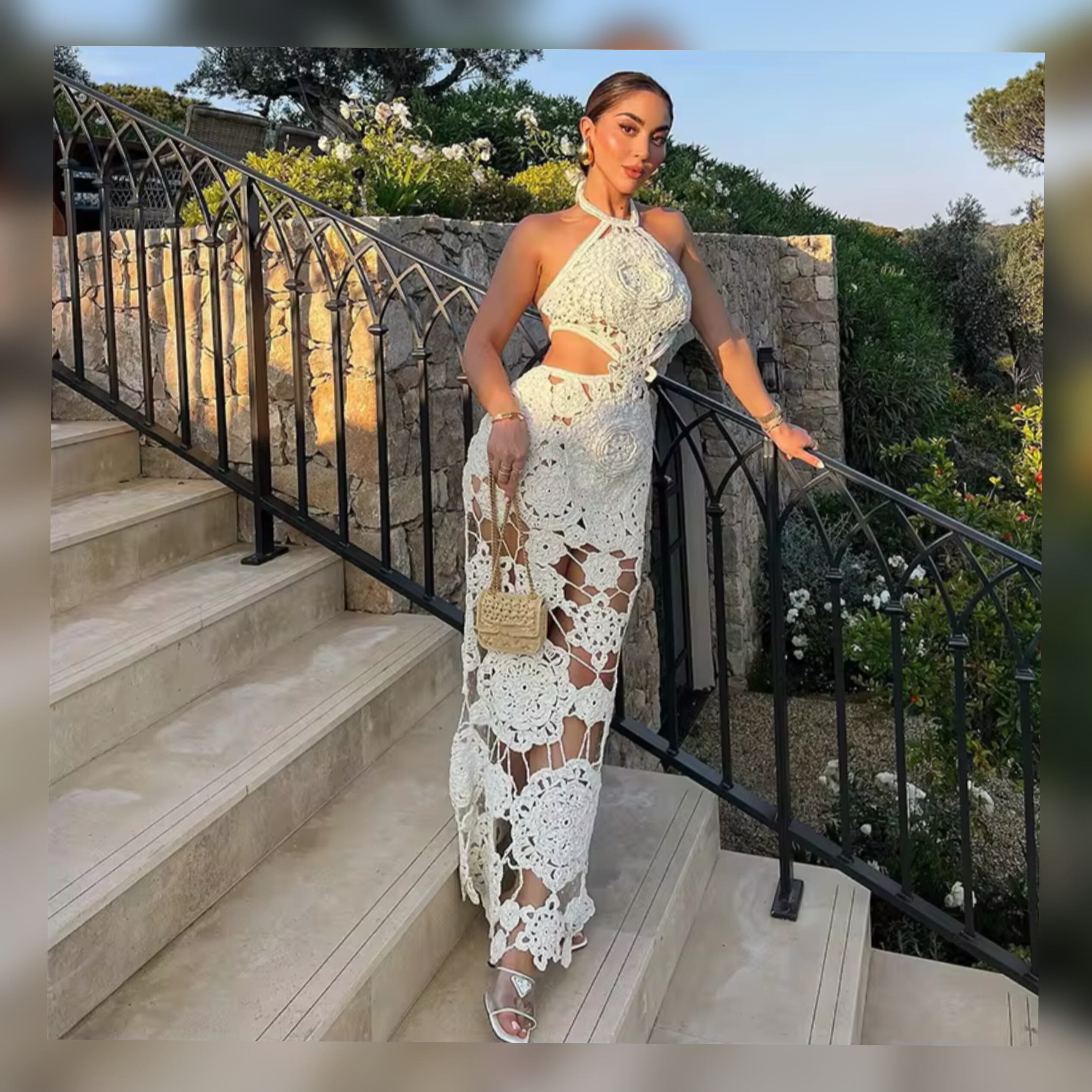 夏にぴったりの涼しいニット素材で作られたロングワンピース。セクシーでオシャレなデザインでリゾートでも抜群に目を奪われること間違いなし。