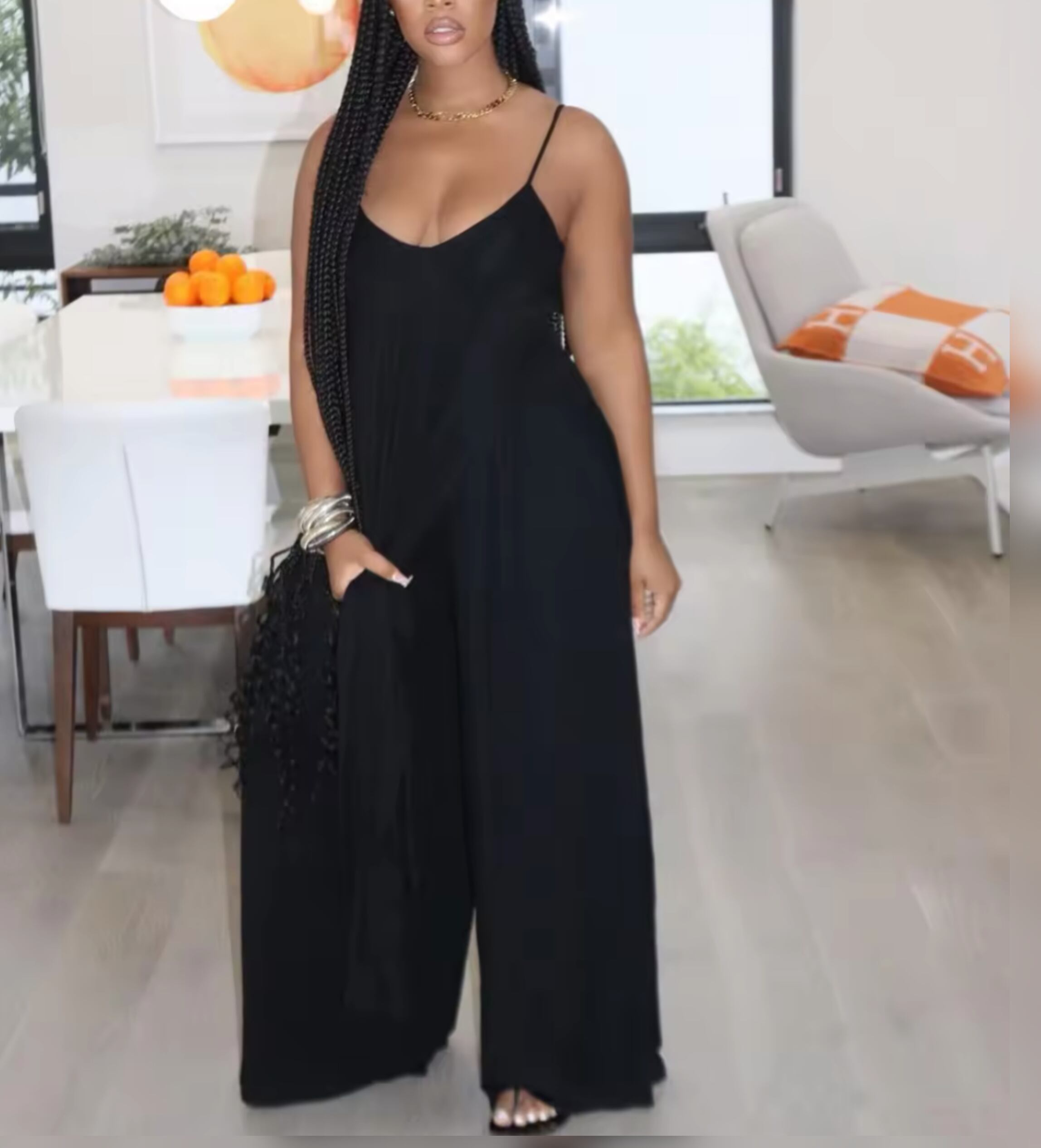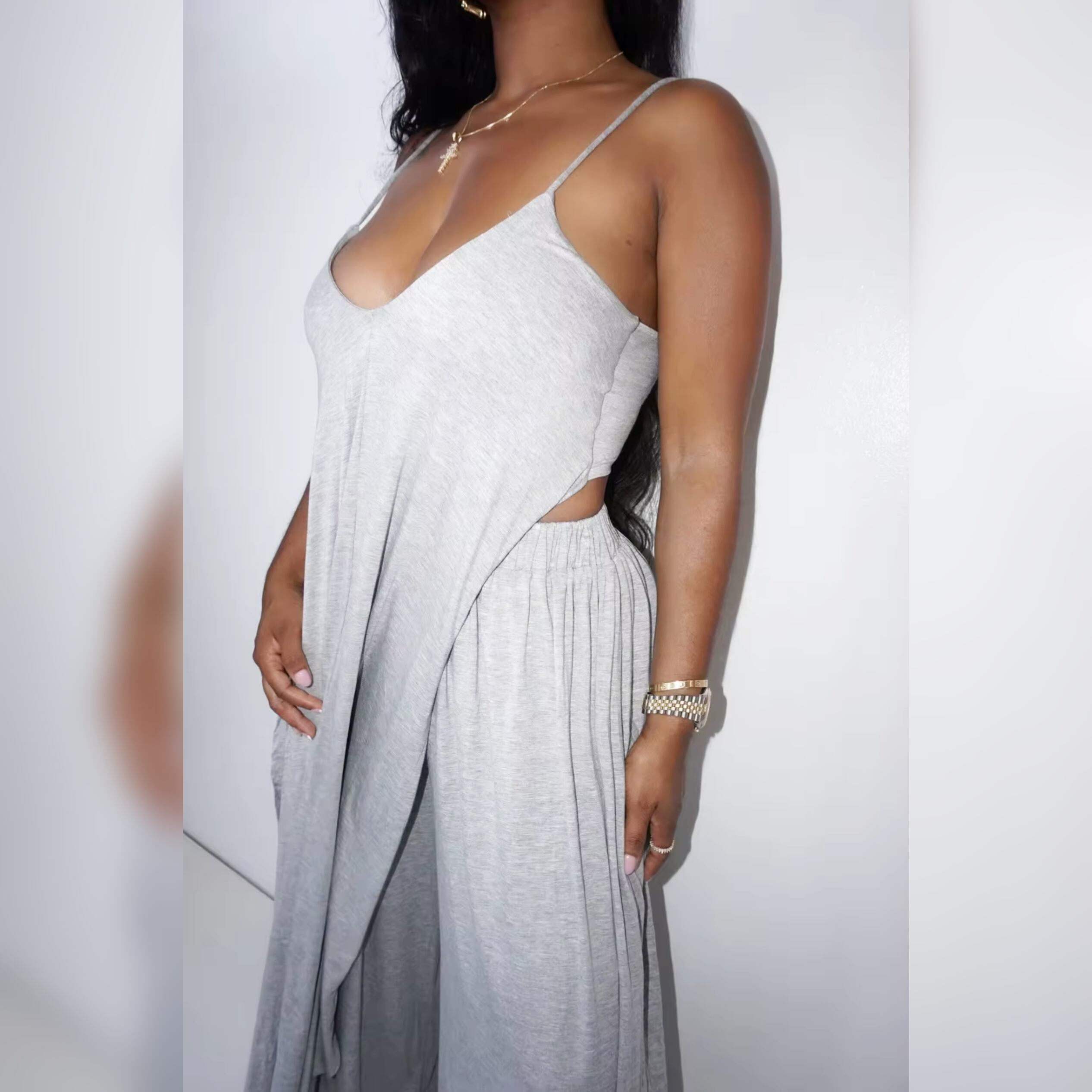 トップスは胸元がホルターネックのように少し深くなり、パンツのワイドさも写真通り!シルエットめちゃくちゃいいです◎おすすめ商品!